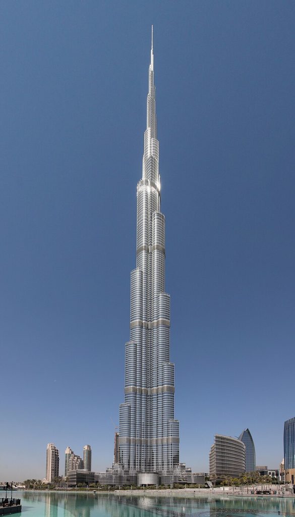 The Burj Khalifa[a] (known as the Burj Dubai prior to its inauguration) is a megatall located in Dubai Al, United Arab Emirates. With a total height of 829.8 m (2,722 ft, or just over half a mile) and a roof height (excluding the antenna, but includes a 242.6 m spire)[2] of 828 m (2,717 ft), it is the world’s tallest structure. It also has held the record of the tallest building in the world since its topping out in 2009, surpassing the Taipei 101, which had held the record since 2004.[3][4] external linkhttps://en.wikipedia.org/wiki/Burj_Khalifa